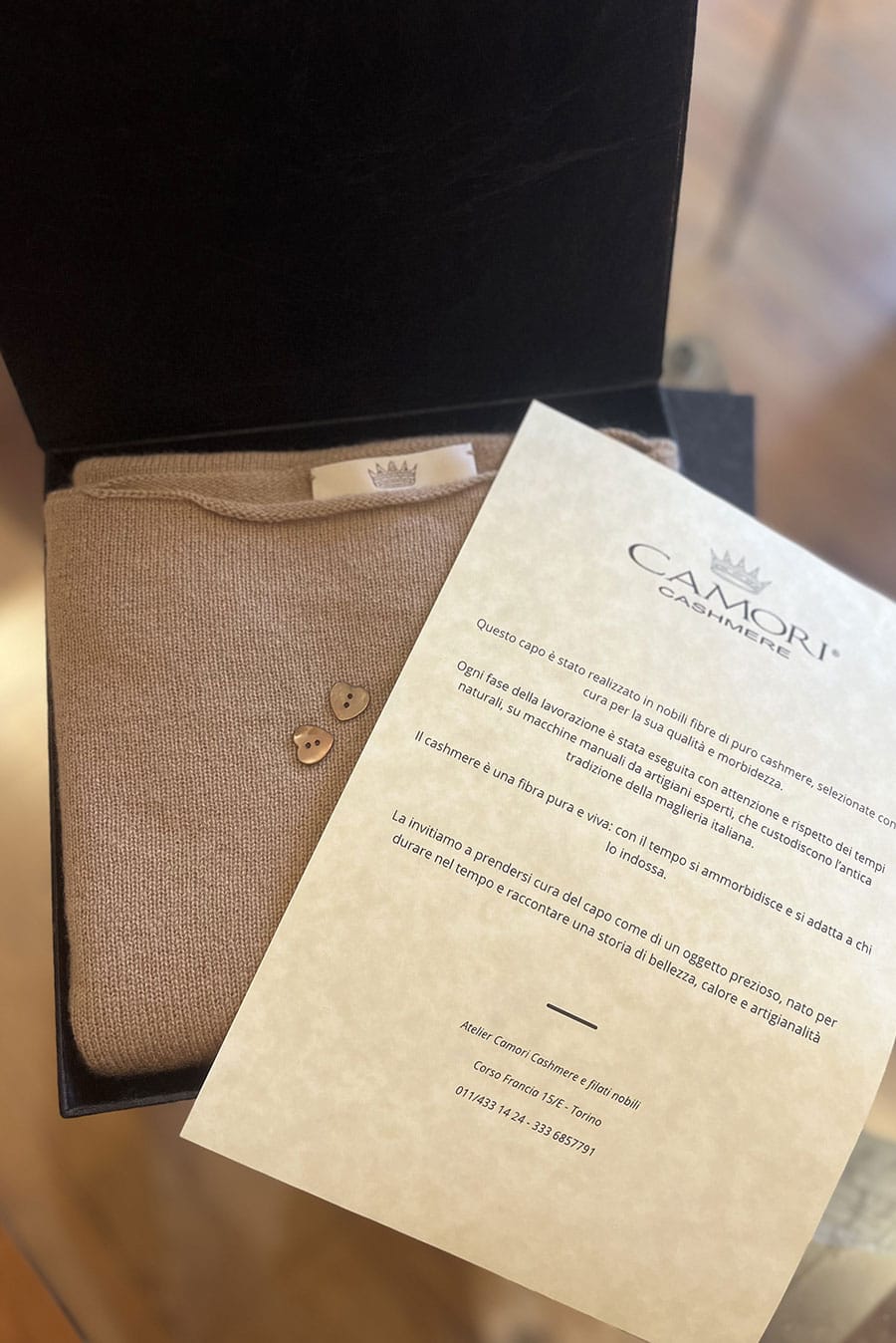 Da Camori sei protagonista della creazione: scegli tra filati pregiati, colori, taglie e dettagli per un capo che riflette il tuo stile personale. Ogni maglia, cardigan o twinset nasce su misura, valorizzando la morbidezza e l’eleganza del cashmere.