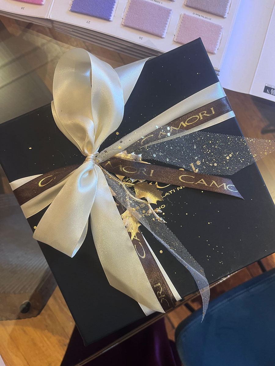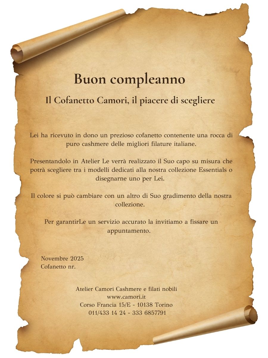 Presentando il cofanetto nel nostro atelier, potrà vivere l’esperienza di creare il suo capo su misura, scegliendo tra i modelli della collezione Camori o disegnandone uno esclusivamente per sé. Ogni dettaglio, dal colore alla linea, sarà espressione del suo stile e della sua personalità .